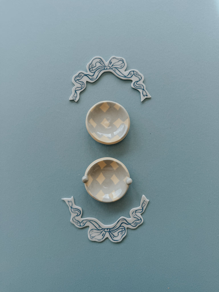 Handmade stoneware mini bowls with a blue-and-cream harlequin pattern and small pom-pom accents on the sides. Ideal for jewelry, spices, salts, or small trinkets. Each bowl is shaped, glazed, and patterned by hand.