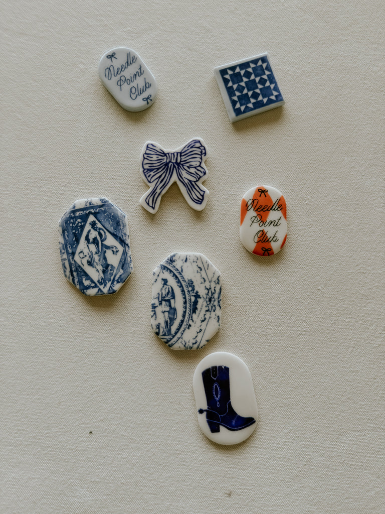 Each one carries a story: quilt-block blues, tiny bows, snippets of toile, Needle point club emblems, or playful nods to the maker’s life. With a strong magnet to keep your needle anchored, they turn a humble tool into a small delight. Each needle minder has a set of two magnets, to use place your project in between the two magnets and it will hold your needle in place.